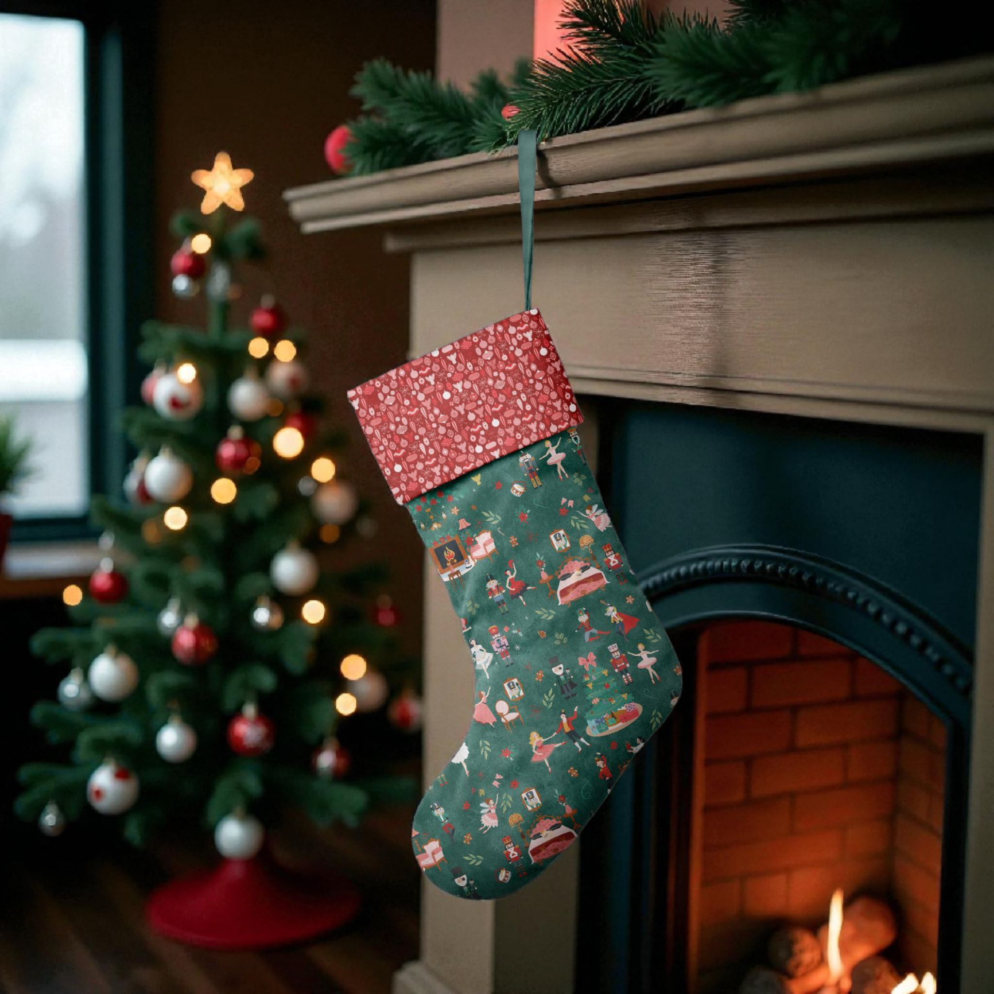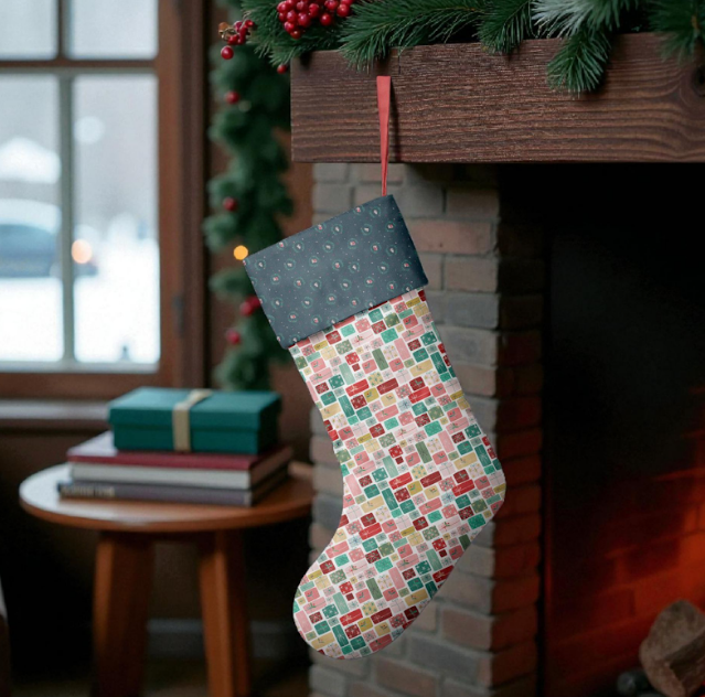 This is a fully lined, traditionally shaped stocking that finishes at 12 and a half by 19 and a half inches. It is sewn with simple curved seams, lightly quilted batting, and a clean finish inside and out. A loop is added for hanging, and the pattern includes an optional printable template or SVG file to help you cut your pieces with precision.