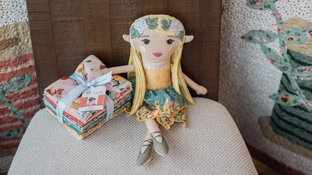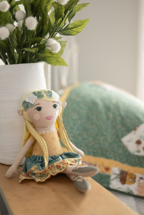 Her design features layered hair pieces, simple embroidered facial details, and a softly shaped skirt inspired by nature. The pattern moves at a steady pace and focuses on clean construction, which makes the sewing experience feel calm and manageable.