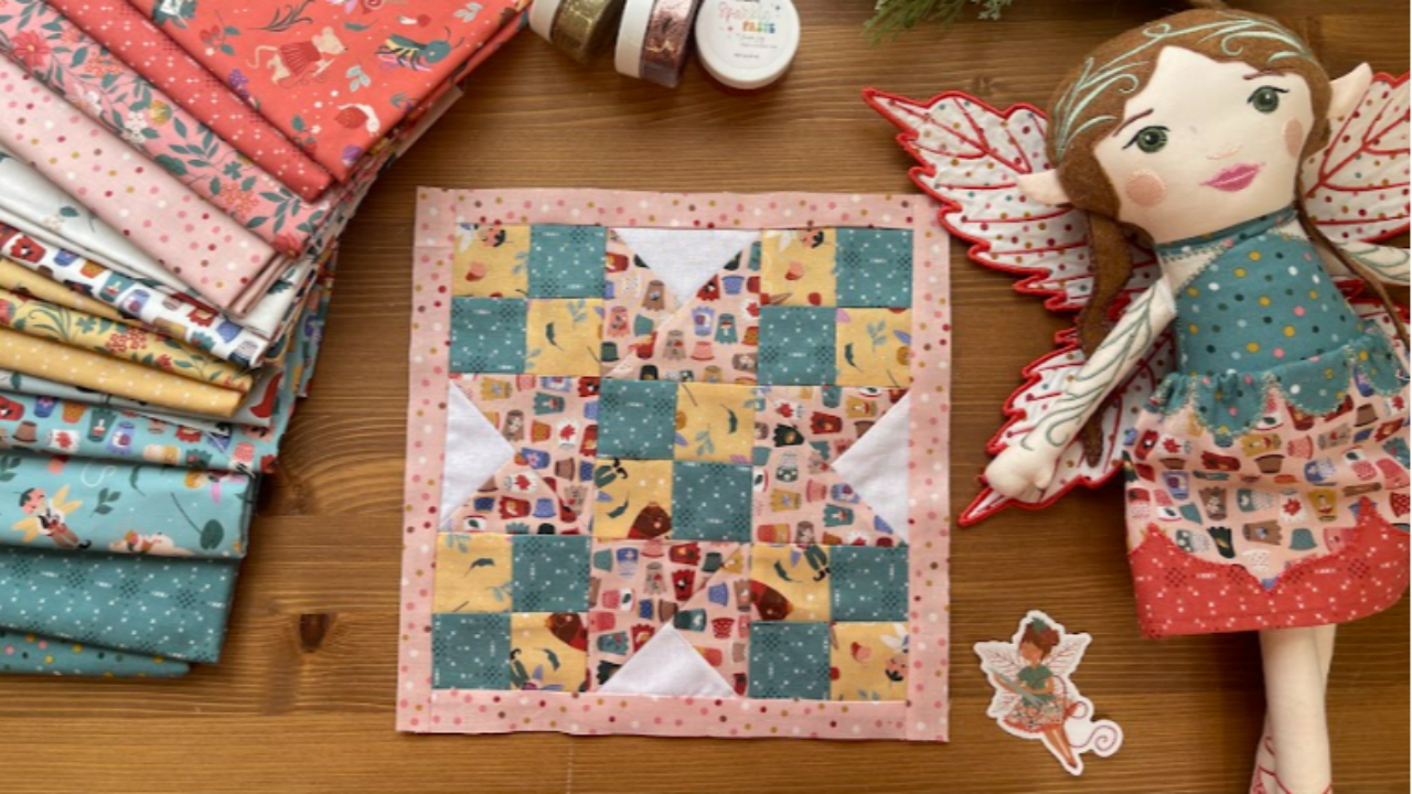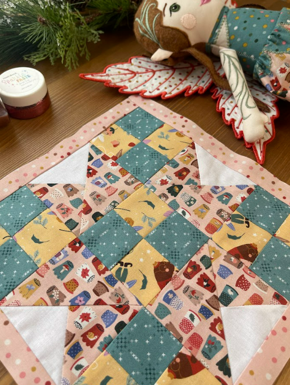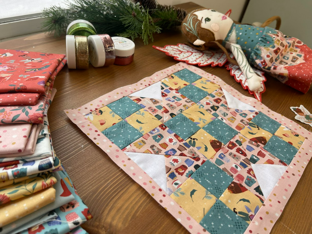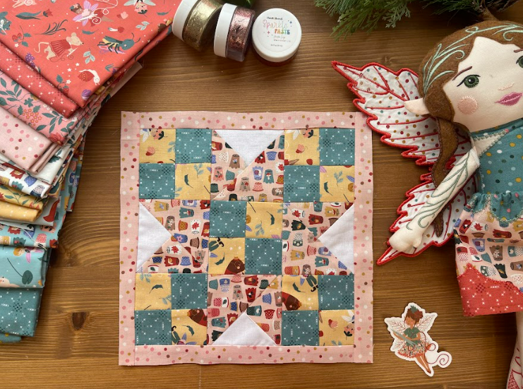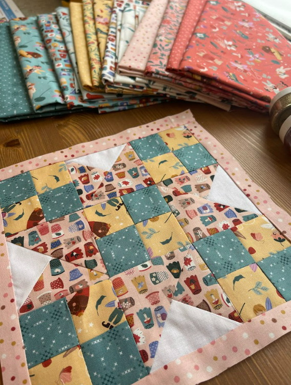 The Thimbelina fabric collection continues to shine in blocks like this. The smaller prints work beautifully in patchwork units, and the mix of florals and sewing motifs adds interest without overwhelming the design. I especially love how the colors come together to create a soft, story filled look.