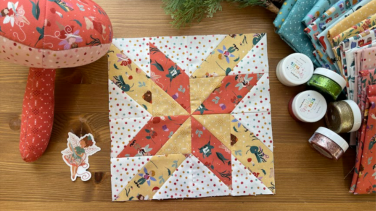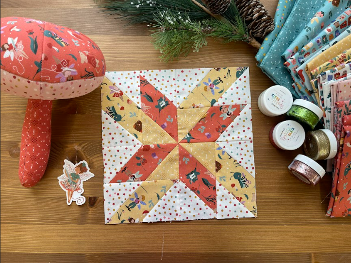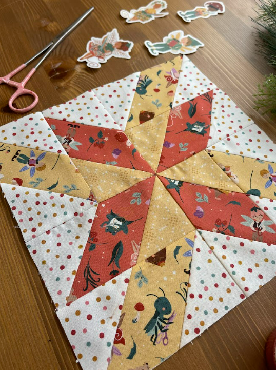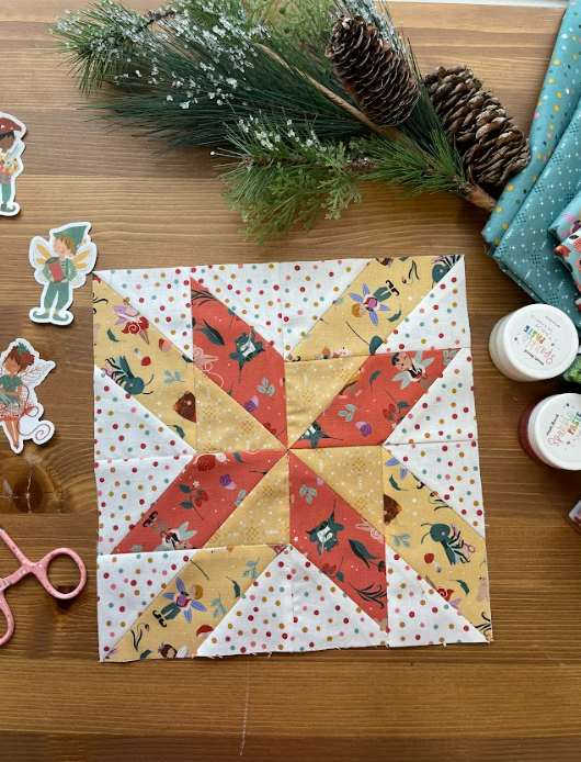 Spin Around finishes at 10 inches by 10 inches and uses rectangles paired with stitch and flip corners to form the rotating design. Amy’s layout gives you flexibility with color placement. You can use contrast to highlight the movement or choose prints that blend more gently. It is a simple block to construct, which makes it a great choice for Week 2 when everyone is finding their pace in the challenge.