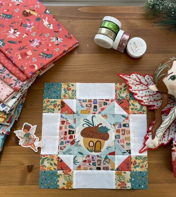 Tulip Toss comes together with simple units that form a flower shape once the pieces are joined. It has a nice balance of structure and openness, which makes it a block that works well with many different fabrics. I enjoyed seeing how the Thimbelina prints filled the petal shapes and how the block brightened once everything was pressed.