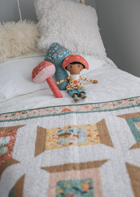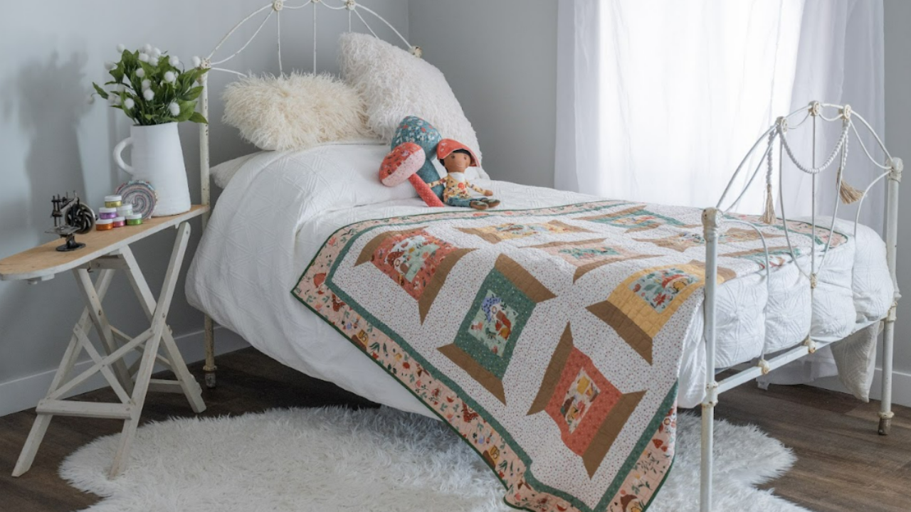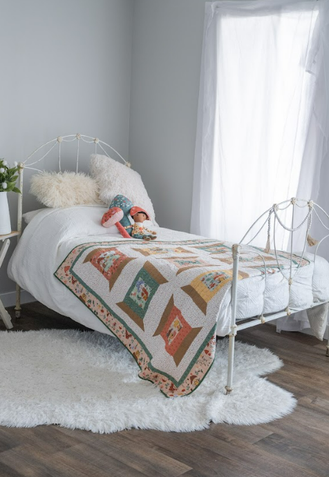 The Spoolful of Charm quilt features a grid of spool blocks framed with simple borders. In the sample quilt, the spool centers highlight storybook prints from the Thimbelina collection. These small details add personality to each block and make the quilt feel playful without being busy.
