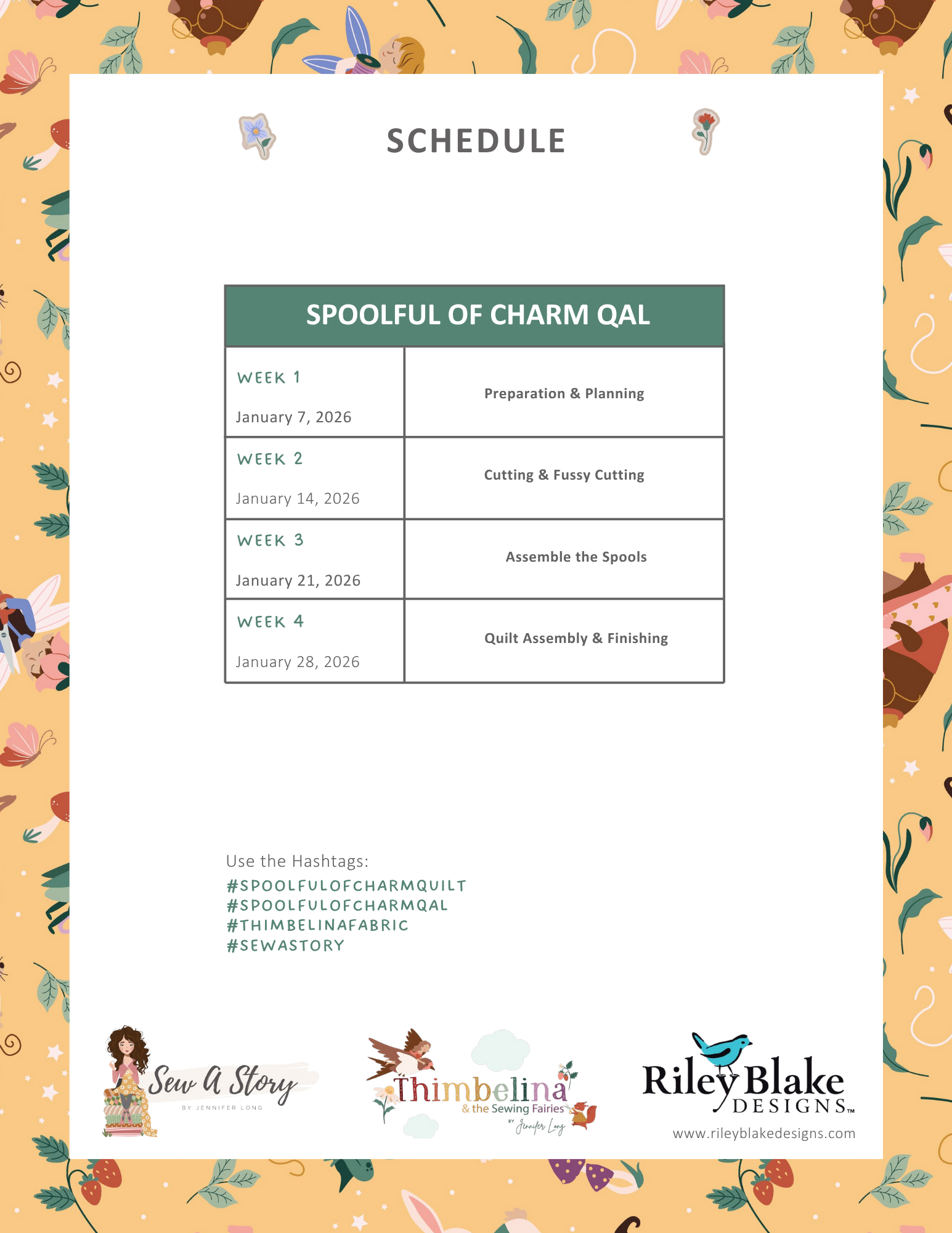 As you gather your fabrics and begin planning your blocks, feel free to share your Week 1 photo on social media using #SpoolfulOfCharmQAL and #SewAStory. It is always inspiring to see the fabrics you choose and how you prepare for each step.